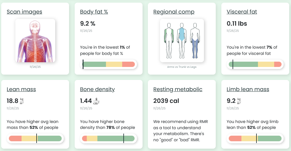 In retrospect, by the time of the scan usually I have almost eaten half of my daily calories and drunk quite a bit of water, so in the end I was about 5 lbs heavier than the weight I measured in the morning. The hope is this underestimate my body fat percentage which implies I can have a bit more leeway when cutting.